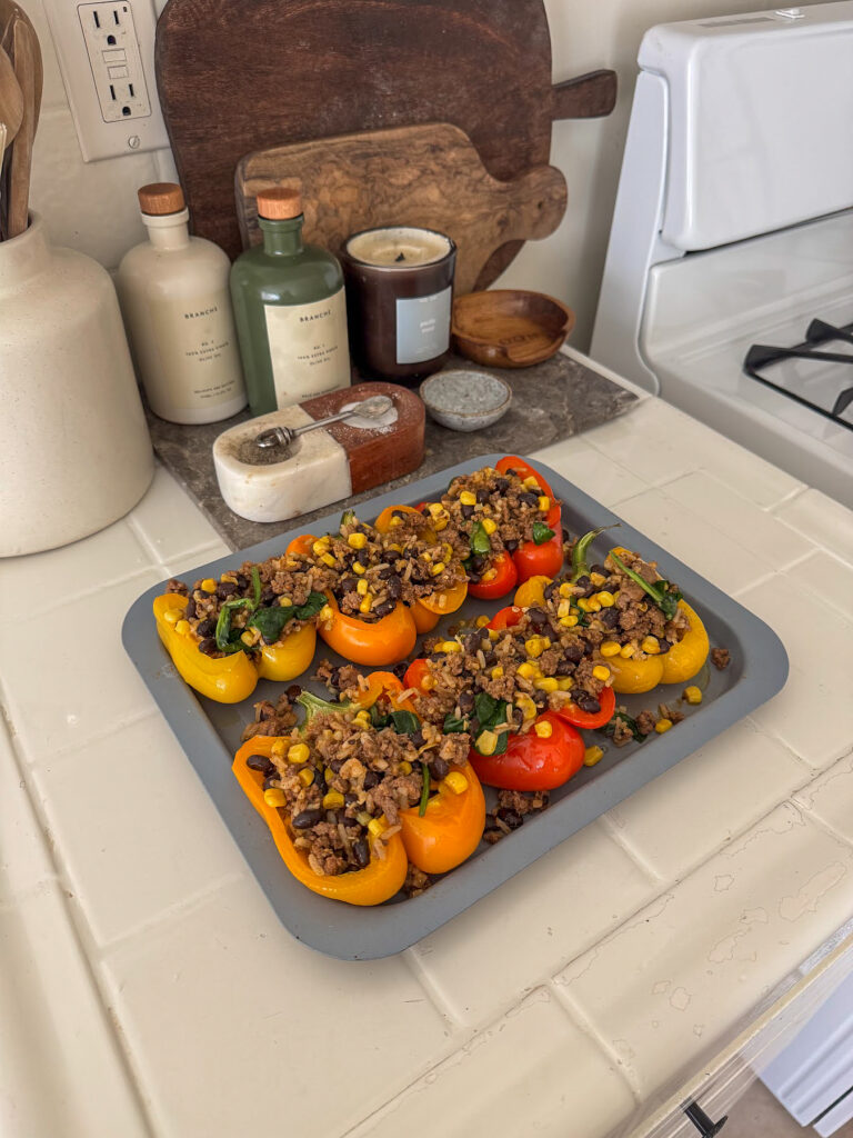 Fill each pepper half with the ground beef mix and place back in the oven for about 15 minutes.