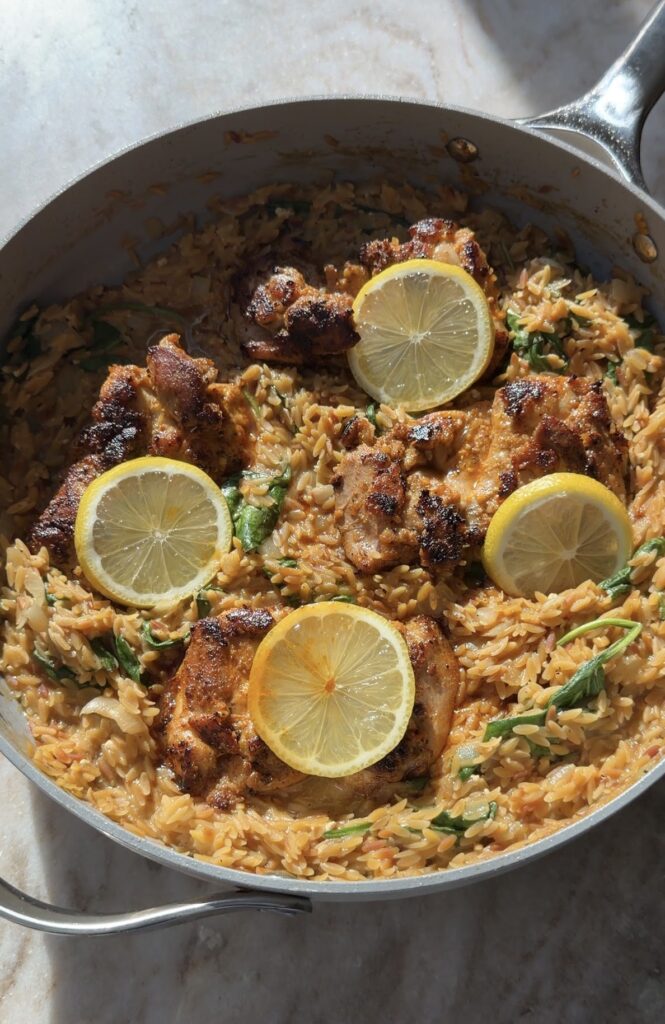 Lately I’ve been craving meals that feel comforting and satisfying but still align with how I like to eat: simple, protein-forward, and made with (mostly) whole foods. And this Lemon Chicken Orzo checks all my boxes! It’s warm, cozy, a little creamy, and has that bright lemony flavor that keeps it from feeling too heavy.