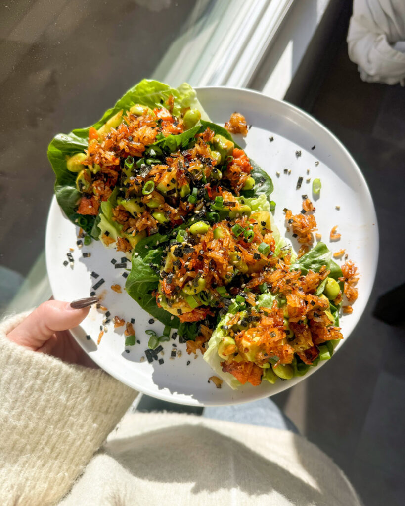 Build your lettuce cups: add the salmon to lettuce cups. Top with the avocado salsa and crispy rice. Enjoy!