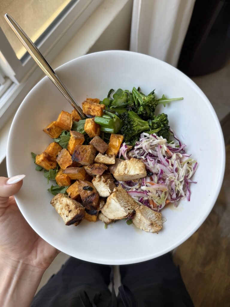 If you’ve ever tried the Hot Honey Chicken Plate from Sweetgreen, you know how good it is!! It’s sweet, spicy, satisfying, and packed with flavor. It quickly became one of my go-to orders, so I knew I had to recreate a version at home with a few simple swaps to make it my own. This Hot Honey Chicken Bowl is just as crave-worthy, with blackened chicken, crispy air-fried sweet potatoes, grilled broccolini, a tangy slaw, and a drizzle of hot honey for that perfect sweet heat. It’s hearty, nutrient-packed, and comes together with everyday ingredients. Plus, it’s perfect for a weeknight dinner or meal prep (my fav)! Let’s get into the recipe…